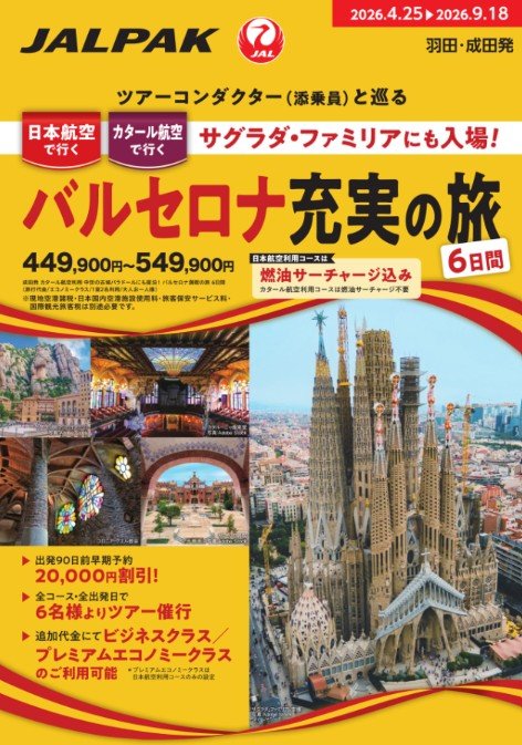 ツアーコンダクターと巡る 日本航空で行く カタール航空で行く サグラダ・ファミリアにも入場!バルセロナ充実の旅 6日間 - 設定期間:2026年4月~9月