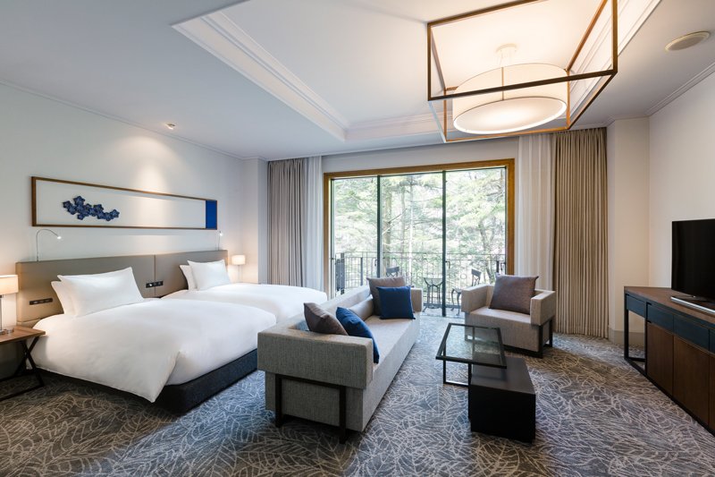 旧軽井沢銀座から徒歩約5分の好立地。お部屋は48㎡以上の広々とした間取り。客室のミニバーは無料です。
