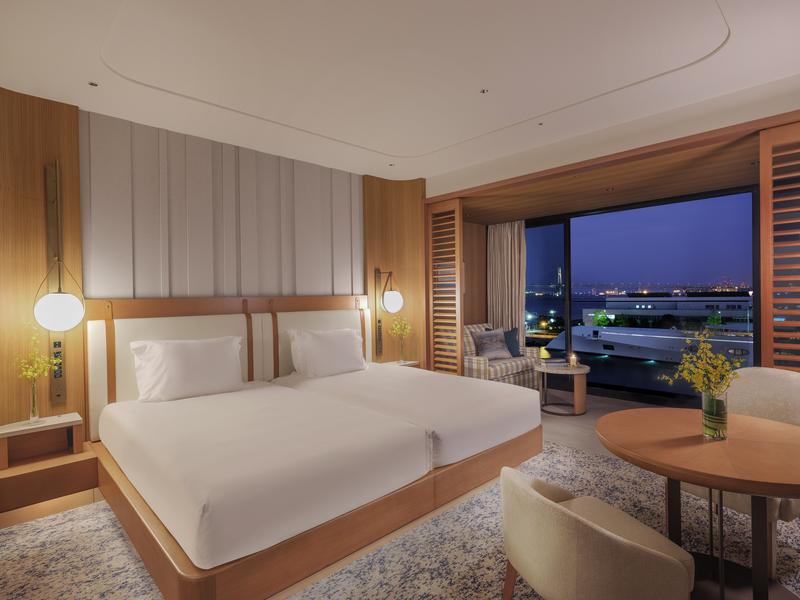 みなとみらい21新港地区の埠頭に建つ、3方を海に囲まれた国内でも希少な海上立地のホテルです。