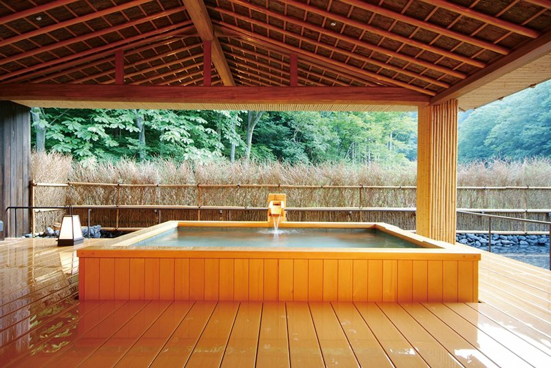 伊香保温泉「黄金の湯」の豊富な湯量が自慢の宿。19種類の浴槽で温泉を存分に楽しめます。